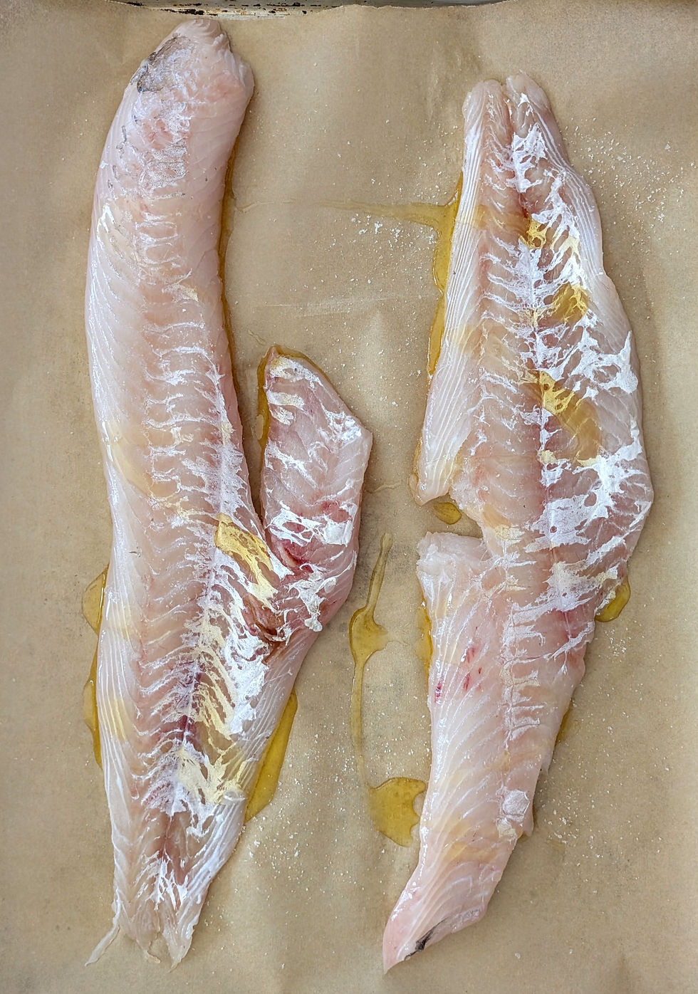 Place fish on a sheet tray, drizzle with olive oil, and sprinkle with salt.