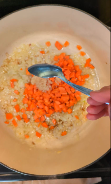 Add diced carrot and garlic and continue to cook until carrots soften and begin to brown.